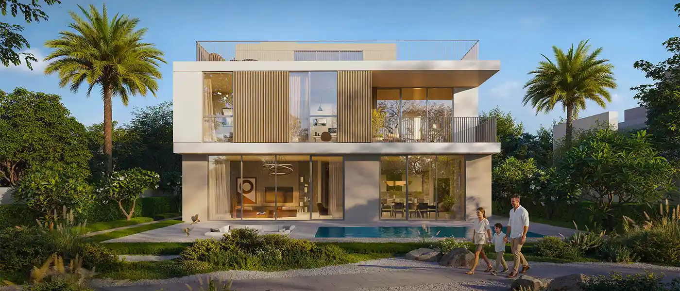 The development features contemporary architecture with soft earthy tones, expansive glass elements, sustainable materials, and minimalist lines that create timeless appeal. Interiors are crafted as wellness-focused sanctuaries, featuring open layouts, large windows, terraces, and natural light that blend indoor and outdoor living harmoniously. The community includes 54 four-bedroom villas, along with 55 luxury and 30 premium five-bedroom homes, all designed with functionality and sophistication in mind.